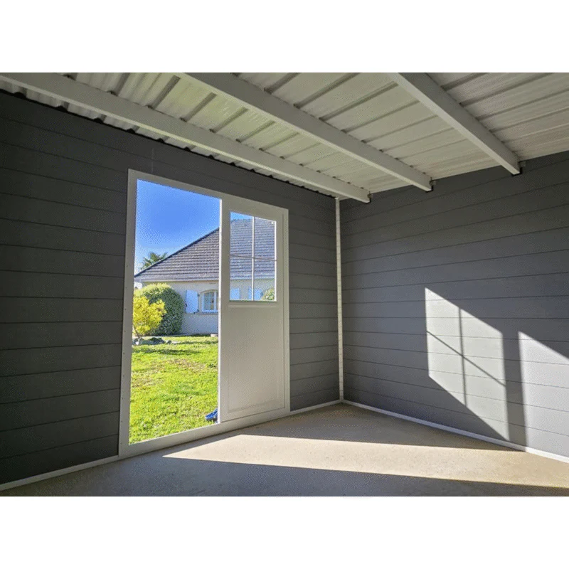 - Dimensions intérieures : 2,96 x 2,80 m (H. mur : 2,27 m / H. totale : 2,33 m)